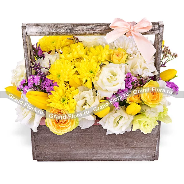 Стандартный: хризантема кустовая желтая - 3 шт., тюльпан желтый - 9 шт., роза кустовая желтая- 2 шт., эустома белая - 3 шт., хризантема одноголовая белая - 2 шт., статица, лимониум, бант, оазис, деревянный ящик. Примерный размер: 30Х30 см.